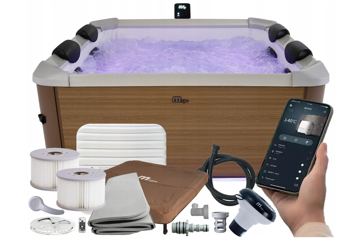 W zestawie: niecka, pokrywa, pompa spa, mata pod spa. 2 filtry, wąż do pompowania, dozownik, 4 zagłówki, taśma LED + pilot, adapter do węża ogrodowego