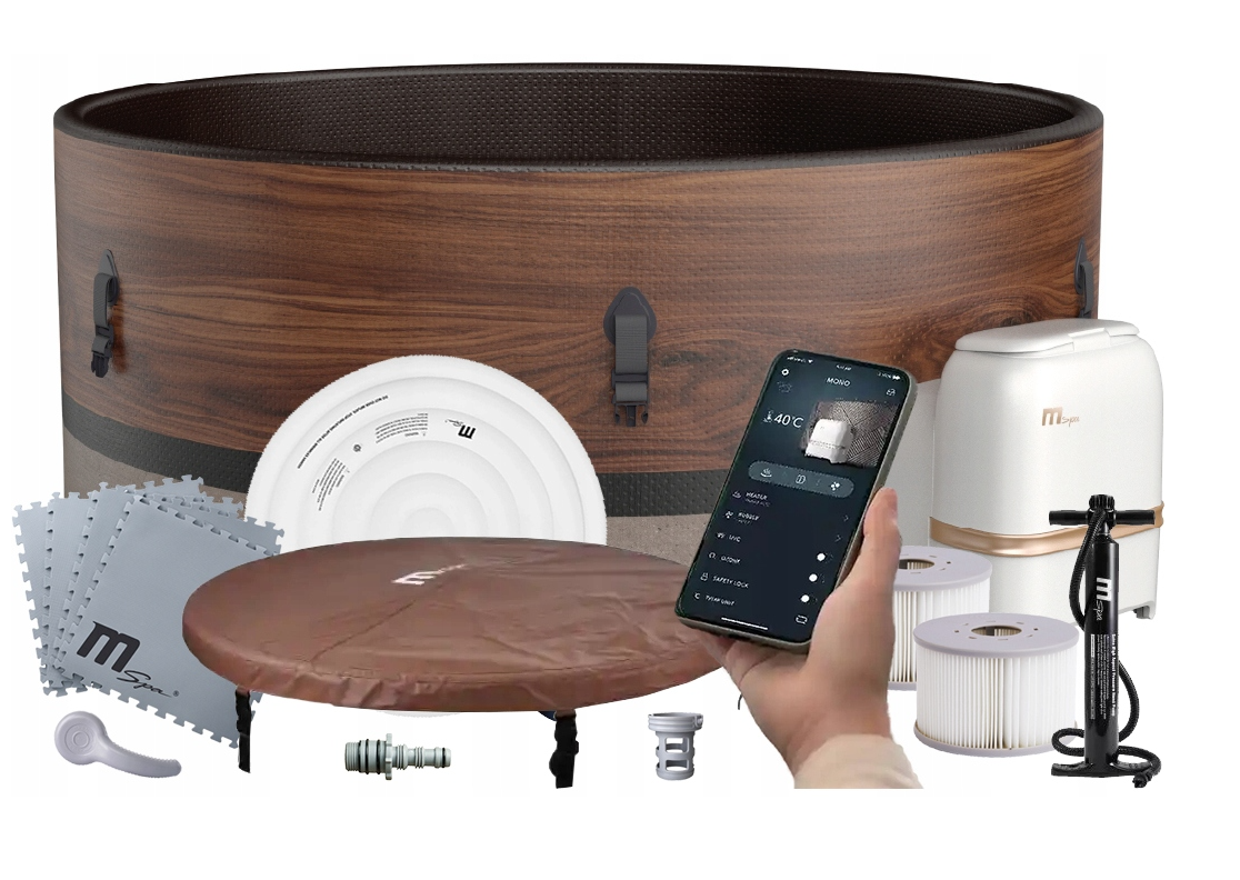 W zestawie: niecka, pokrywa, pompa spa, 2 filtry, mata puzzle pod spa, pompka tłokowa, dozownik, adapter do węża ogrodowego, łata do napraw